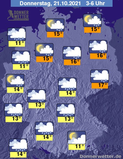 In der Nacht zum Donnerstag ziehen größtenteils dichte Wolken durch, dazwischen kann es auch mal etwas auflockern. Es bilden sich wiederholt, teils kräftige Schauer. Im Nordwesten sind zudem Gewitter möglich. Die Temperatur sinkt auf 17 Grad in Dresden und bis 11 Grad in Münster. Es weht ein starker, verbreitet auch stürmischer Wind. An den Küsten und auf den Bergen herrscht Sturm.