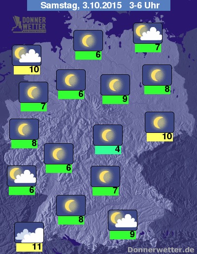 Am Tag der Deutschen Einheit zeigt sich vor allem über der Nordhälfte noch ein oft wolkenloser Himmel. Im Süden und im Tagesverlauf auch in der breiten Landesmitte ziehen jedoch teils dichtere Wolken auf, die jedoch nur selten etwas Regen bringen, sonst scheint zwischen den Wolken aber auch immer wieder die Sonne. Die Temperatur steigt auf 18 Grad im Münsterland und bis etwa 21 Grad im Kraichgau.