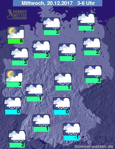 In der kommenden Nacht bleibt es fast landesweit bedeckt, westlich des Rheins lockert der Himmel vielerorts auf, hier bleibt es auch meist trocken, sonst fällt über der Südhälfte jedoch immer wieder Regen, Schneeregen oder Schnee, im Norden meist nur Regen. Die Temperatur sinkt auf 6 Grad in Cuxhaven und bis -1 Grad im Alpenvorland.