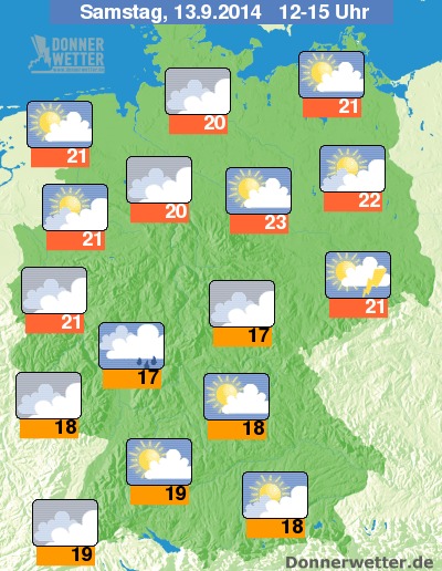 Die berechneten Temperaturen liegen im Regen im Südosten bei teils nur 13 Grad, bei Sonnenschein können am Samstag in Berlin dagegen bis zu schwülwarmen 27 Grad erreicht werden.