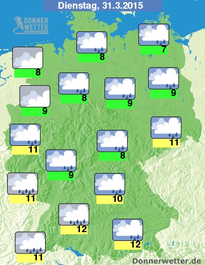Heute fällt unter dichten Wolken teils langanhaltender, ergiebiger und auch kräftiger Regen. Auflockerungen bleiben selten. Die Temperatur steigt auf 7 Grad an der Ostsee und bis 12 Grad in Baden-Baden. Es herrscht verbreitet Sturm mit schweren und auch orkanartigen Böen. An den Küsten und auf den Hochlagen der Mittelgebirgen sind Orkanböen möglich.