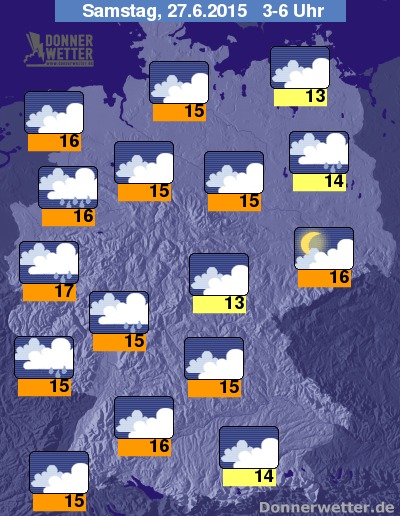 In der folgenden Nacht ziehen von Westen dichte Wolken durch und nachfolgend entwickeln sich zunächst im Westen, gegen Morgen auch im Südwesten, Nordwesten bis in die Mitte des Landes zum Teil kräftige Schauer und Gewitter. Im Norden, Osten und im äußeren Süden bleibt es bei wechselnder bis starker Bewölkung weitgehend trocken. Die Temperatur sinkt auf 17 Grad in Möchengladbach und bis 13 Grad im Grabfeld.