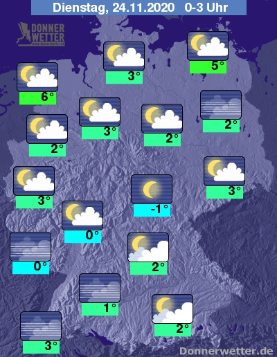 Die Temperaturen erreichen um -3 Grad in Nordbayern und um 6 Grad in Ostfriesland.