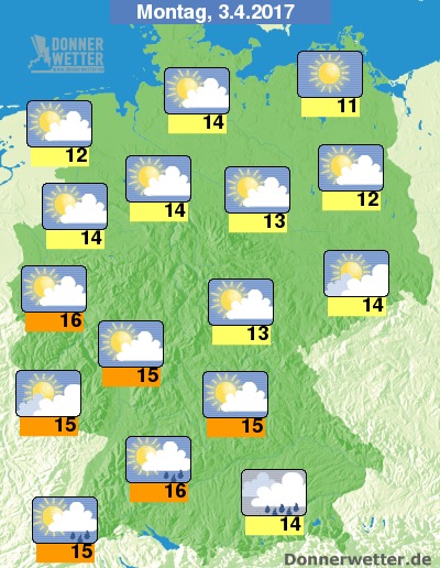 Am Montag kann die Sonne zwischen meist nur lockeren Wolken häufig scheinen. Im Alpenvorland halten sich jedoch meist dichte Wolken, die hier auch für einzelne Schauer sorgen, sonst ist es im Süden teils heiter, teils stärker bewölkt, aber weitgehend trocken. Die Temperatur steigt auf 11 Grad an der Ostsee und bis etwa 16 Grad in Karlsruhe.
