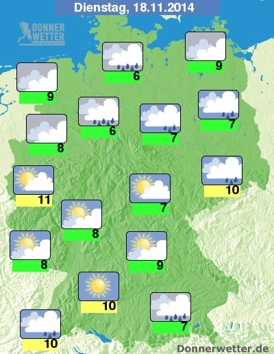 Am Dienstag zieht sowohl im Süden und Südosten, als auch im Osten und Norden Regen auf, in den anderen Landesteilen bleibt es teils aufgelockert, teils stark bewölkt und weitgehend trocken. Im Westen ist es auch häufig heiter und es bleibt trocken. Die Temperatur steigt auf etwas kühlere 6 bis 11 Grad.