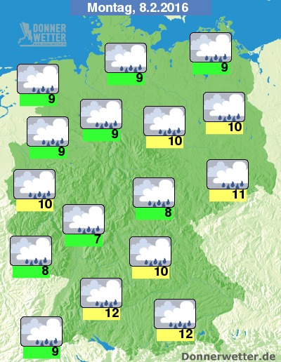 Am heutigen Rosenmontag ist es im Süden und Osten anfangs noch teils aufgelockert, oft auch schon stark bewölkt, jedoch mehrheitlich noch trocken, im großen Rest des Landes ziehen aber bereits weitgehend dichte Wolken übers Land und es fällt immer wieder, zum Teil kräftiger und auch langanhaltender Regen. Am Nachmittag sind im Norden und Westen auch vereinzelte, kurze Gewitter nicht auszuschließen. Dazu weht ein verbreitet starker bis stürmischer Wind, selbst im Flachland sind schwere Sturmböen möglich. In höheren Lagen und an der See herrscht oft Sturm mit teils orkanartigen Böen. Die Temperatur steigt auf 7 Grad im Westerwald und bis 12 Grad in Stuttgart.