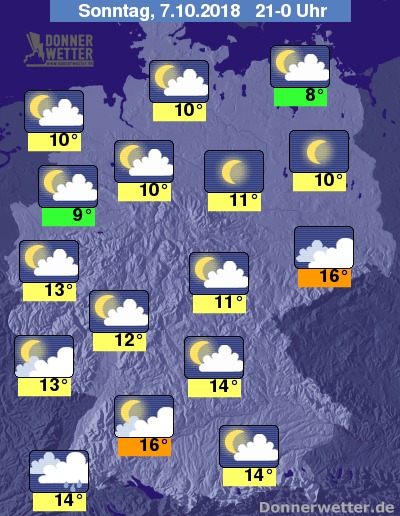 In den späten Abendstunden bleibt es bei zumeist lockerer Bewölkung im Norden, in der Osthälfte klart der Himmel auch regional auf. Im Süden sind die Wolken stellenweise dichter, am Oberrhein muss vereinzelt auch mit Schauern gerechnet werden.