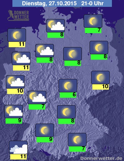 Heute Abend ziehen in den westlichen Landesteilen einige, noch weitgehend aufgelockerte Wolken auf, weiter nach Osten hin zeigt sich der Himmel dagegen weiterhin sternenklar bei nur wenigen Wolken. es bleibt im ganzen Land trocken. Die Abendtemperatur liegt bei 11 Grad an der Nordsee und um 6 Grad im Thüringer Becken.