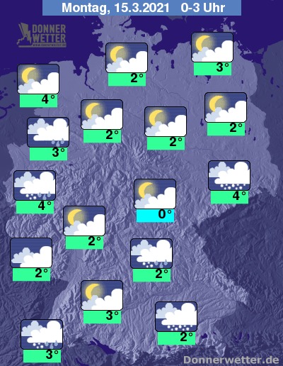 In der Nacht auf Montag verdichten sich die Wolken auch über der Nordhälfte Deutschlands wieder, Auflockerungen beschränken sich bis zu den frühen Morgenstunden dann vor allem noch auf das Gebiet zwischen Weser und Elbe. Hier sowie entlang der Oder bleibt es im Zuge häufiger trocken, in den übrigen Landesteilen muss verbreitet mit schauerartigem Regen gerechnet werden, im Bergland fällt auch Schnee.
