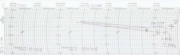 Tiefer Luftdruck begleitet uns über weite Teile der letzten Aprilwoche. Unser Luftdruckschrieb zeigt das vorangegangene Zwischenhoch, welches uns zumindest am heutigen Montag noch einen vielfach freundlichen und trockenen Wochenbeginn beschert.