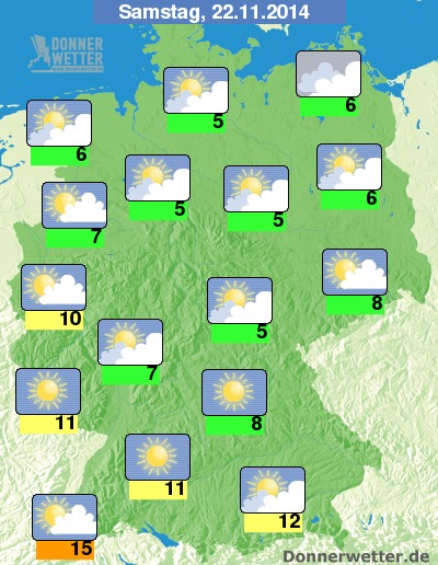 Das kommende Wochenende verspricht, nach den derzeitigen Modellläufen, verbreitet ruhig, trocken und auch häufig freundlich zu werden. Am Tage steigen die Temperaturen auf insgesamt milde Werte zwischen etwa 5 Grad im Vogtland und bis zu 15 Grad in Freiburg. Dabei ziehen meist lockere Wolkenfelder durch, gebietsweise wird es sogar sonnig. Für die Nächte wird jedoch vor allem im Süden und Osten des Landes verbreitet leichter Frost vorhergesagt. Da sich nachts die Luft in Bodennähe weiter abkühlen kann, besteht aber auch im Westen und Norden des Landes verbreitet Bodenfrostgefahr, dabei kann es durch möglichen Rauhreif stellenweise glatt werden.