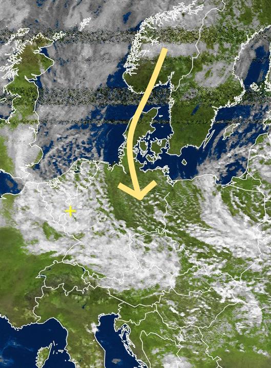 In weiten Teilen von Norddeutschladn lacht heute aufgrund des Skandinavienföhns die Sonne. Es ist trocken und sonnig. In NRW und am Alpenrand dagegen regnet es. Hier ist unser Satbild, wo der Föhn und die Strömung gut zu sehen ist: