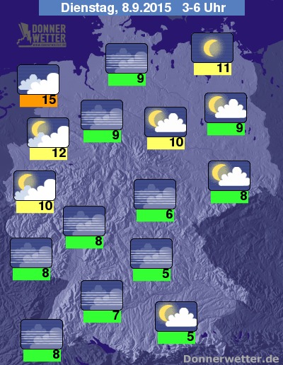 In der Nacht zum Dienstag zeigt sich der Himmel überwiegend sternenklar, besonders im Nordwesten ziehen jedoch teils dichte Wolken auf, dabei bleibt es trocken. Stellenweise bildet sich bis zum Morgen jedoch Nebel oder Dunst. Die Temperatur sinkt auf 15 Grad in Ostfriesland und bis 5 Grad in Mittelfranken.