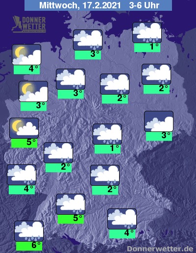 In der folgenden Nacht ist der Himmel größtenteils dicht bewölkt, dazu zieht von Westen her Regen einmal von West nach Ost übers Land hinweg. Im Laufe der zweiten Nachthälfte lockert es jedoch im Westen und Nordwesten wieder auf und hier bleibt es dann trocken. Die Temperatur sinkt auf 6 Grad in Freiburg und bis 1 Grad in Rostock.