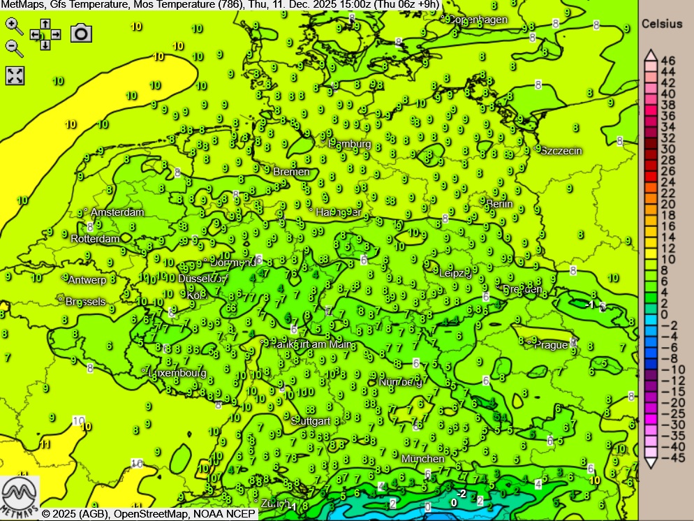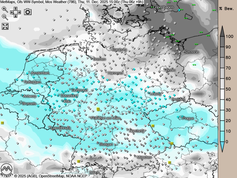 Die Temperatur- und Wetterkarte für Donnerstagnachmittag (15:00 Uhr) nach GFS: