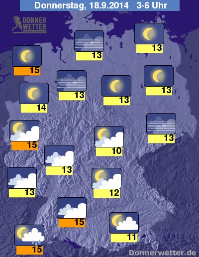 In der Nacht zum Donnerstag bleibt es in der Nordhälfte des Landes zumeist sternenklar. Im Süden, besonders nach Südwesten hin ziehen aber zunehmend dichtere Wolken auf und es können sich vereinzelt Schauer und Gewitter bilden, sonst bleibt es aber trocken. Stellenweise bildet sich Nebel oder Dunst. Die Temperatur sinkt auf 15 Grad in Schwaben und 10 Grad im Frankenwald.