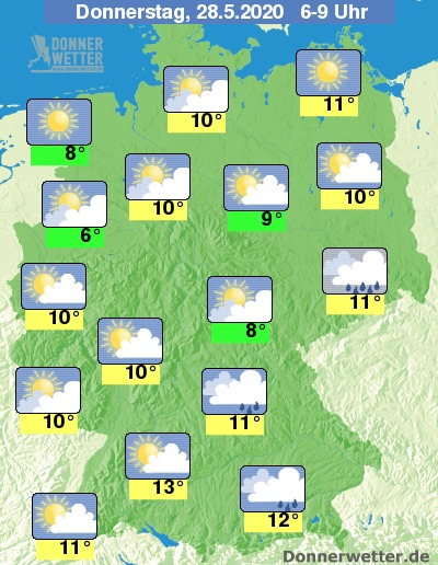 Bis zu den Frühstunden kühlt die Luft auf 12 bis 6 Grad ab, im Südwesten halten sich die Temperaturen meist im zweistelligen Bereich auf.