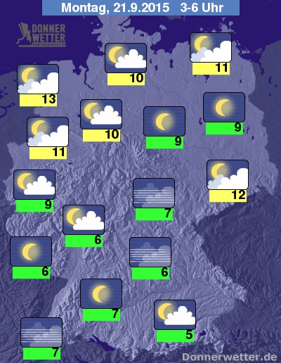 In der bevorstehenden Nacht zeigt sich der Himmel über der Südhälfte des Landes, sowie im Osten verbreitet sternenklar. Zeitweise dichte Wolken sind insbesonders im Nordwesten Deutschlands möglich, dabei ist aber nur gelegentlich auch etwas Regen möglich. In den übrigen Landesteilen zieht zumeist lockere, teils auch aufgelockerte Bewölkung durch und es bleibt trocken. Die Temperatur sinkt auf 13 Grad in Ostfriesland und bis 5 Grad in Münchner Umland. Stellenweise bildet sich Nebel oder Dunst.