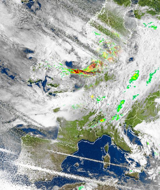 Auf dem Satellitenfoto von heute Morgen sind die kompakten Wolken eines Tiefs über Südskandinavien zu sehen, die vor allem über der Nordsee oft kräftige Schauer mit sich brachten. Die Ausläufer des Tiefs bringen jedoch auch verbreitet dichte Wolken über dem übrigen Mitteleuropa, dabei fällt bspw. im Stau der Nordalpen gebietsweise langanhaltender und ergiebiger Regen.
