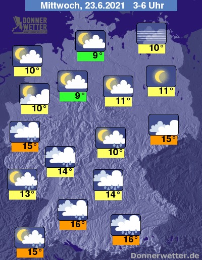 Am Mittwoch ist es im Süden stark bewölkt und es bilden sich hier vielerorts Schauer, zudem entwickeln sich einzelne Gewitter. Über dem Norden ist es dagegen meist heiter und trocken. Im übrigen Land ist es teils heiter, teils stark bewölkt, dabei bleibt es zumeist trocken. Die Temperatur steigt auf 17 Grad in Jena und bis 25 Grad in Berlin.