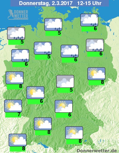 Die Höchstwerte liegen zwischen 5 Grad im Nordseeumfeld und 8 Grad an Rhein und Donau.