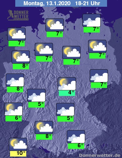 In den späteren Abendstunden nimmt die Bewölkung über dem Westen zu, so dass der Himmel meist bedeckt ist. In den übrigen Landesteilen ist es überwiegend locker bewölkt, an Elbe, Oder und Donau funkeln die Sternen stellenweise auch von einem klaren Himmel. Es bleibt trocken. Der Wind legt nochmals zu und weht teils stürmisch aus Südwest. An den Küsten sowie auf den Gipfeln der Mittelgebirge sind auch Sturmböen möglich.