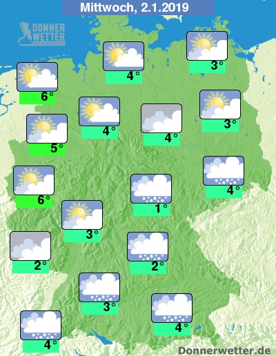 In der Südosthälfte fällt aus kompakten Wolken zeitweise Schnee oder Schneeregen. In höheren Lagen wird es zunehmend winterlich, wobei auch verbreitet mit Straßenglätte gerechnet werden muss. Im übrigen Land wechseln sich sonnige und wolkige Abschnitte miteinander ab, Schauer fallen jedoch nur noch in den Staulagen der Mittelgebirge.