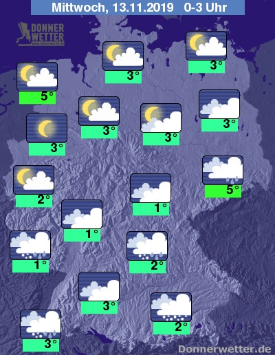 In der Nacht zeigt sich der Himmel in der Nordhälfte zunächst noch häufig locker oder aufgelockert bewölkt, bevor die Bewölkung im Nachtverlauf zunimmt. In der Südhälfte des Landes bleibt der Himmel über die gesamte Nacht stark bewölkt oder bedeckt. Es bleibt überwiegend trocken, nur südlich des Mains sowie im äußersten Südosten muss zeitweise mit Schauern gerechnet werden. Im Schwarzwald sowie in Oberbayern fallen die Niederschläge auch als Schneeregen oder Schnee. Örtlich besteht Glättgefahr!