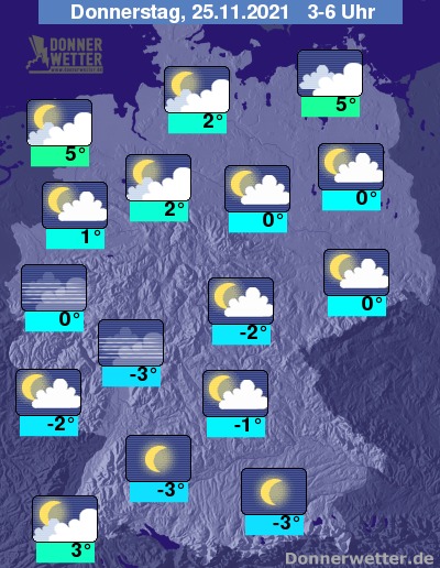 In der bevorstehenden Nacht halten sich vor allem rund um die Küsten, aber auch im übrigen Norden meist dichte Wolken, hier und da kann es aber auch etwas auflockern. Im übrigen Bundesgebiet ist es verbreitet locker bewölkt oder sternenklar, dazu bleibt es trocken. Stellenweise kann sich Nebel bilden. Die Temperatur sinkt auf 5 Grad direkt an der Nordsee und auf etwa -3 Grad im Münchner Umland.