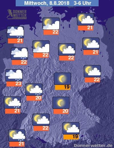 In der Nacht zum Mittwoch bleibt der Himmel etwa über der Osthälfte meist locker bewölkt oder sternenklar, dazu bleibt es trocken. Im übrigen Bundesgebiet ziehen in der Nacht dagegen meist dichte Wolken auf, die vielerorts auch Schauer und örtlich schwere Gewitter bringen. Die Temperaturen bleiben mit Werten zwischen 23 und 19 Grad weitgehend tropisch.