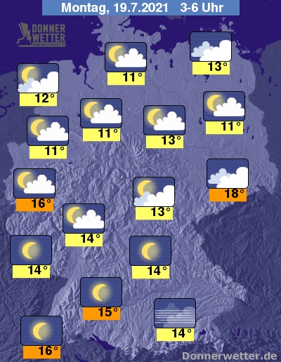 In der Nacht zum Montag ist der Himmel im Süden weitgehend sternenklar, sonst ist es teils sternenklar, teils locker bis aufgelockert bewölkt. Im Norden nimmt die Bewölkung zum Morgen hin etwas zu, dazu bleibt es trocken. Die Temperatur sinkt auf 18 Grad in Dresden und bis 11 Grad in Emmerich.