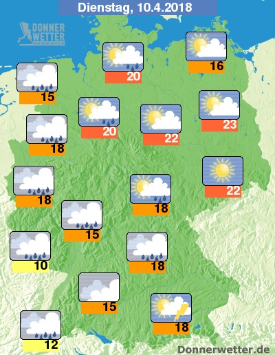 Am Dienstag ist es speziell über der Südwesthälfte Deutschlands deutlich wechselhafter als noch tags zuvor, dabei sind hier gebietsweise Schauer und vereinzelt auch Gewitter möglich. Im Norden und Osten ist es hingegen größtenteils heiter bis sonnig und trocken. Im Tagesverlauf sind aber auch hier vereinzelt Schauer oder Gewitter möglich. Die Temperatur steigt auf nur 10 Grad am Pfälzer Wald und bis 23 Grad in Berlin.