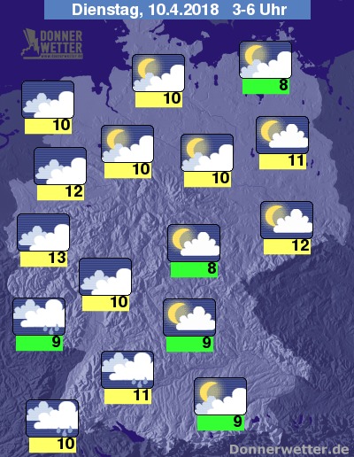 In der kommenden Nacht zeigt sich der Himmel über der Osthälfte Deutschlands oft aufgelockert bewölkt, sonst halten sich aber mehrheitlich dichte Wolken und im Südwesten fällt zudem gebietsweise Regen, sonst bleibt es trocken. Die Temperatur sinkt auf 13 Grad in Köln und bis etwa 8 Grad in Neubrandenburg.