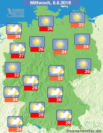 Am Mittwoch ist es über der Südhälfte teils heiter bis sonnig, teils bilden sich hier aber auch dichte Quellwolken und es können sich sowohl Schauer als auch teils kräftige Gewitter entwickeln. Weiter nach Norden hin bleibt es dagegen weitgehend heiter bis sonnig und trocken. Lediglich an der Ems sind örtlich Schauer und Gewitter möglich. Die Temperatur steigt auf 22 Grad in Stralsund und bis 32 Grad in Köln.