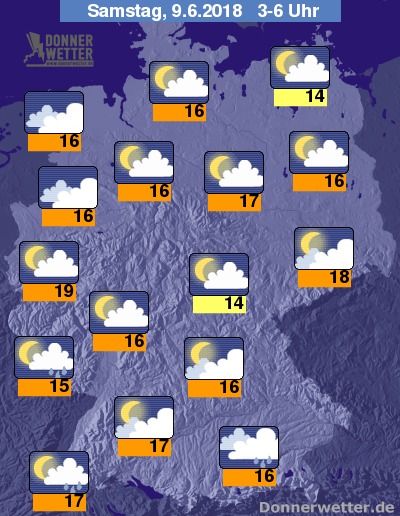 Am Samstag ist es im Land zunächst verbreitet meist heiter und trocken. Im Süden und Westen sind jedoch bereits vormittags Schauer und Gewitter möglich, dazwischen kann sich jedoch immer wieder auch die Sonne zeigen. Am Nachmittag bilden sich auch im Emsland und über Sachsen regional Schauer und Gewitter, sonst bleibt es über der Nordosthälfte meist heiter und trocken. Die Temperatur erreicht 23 Grad in Cuxhaven und bis 32 Grad in Köln.