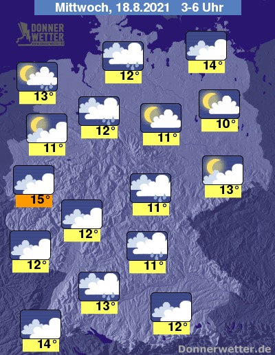 In der folgenden Nacht halten sich vor allem über der Südwesthälfte Deutschlands weitgehend dichte Wolken, dabei fällt gebietsweise Regen. Im Norden und Osten ist es oft nur locker bis wechselnd bewölkt, jedoch können auch hier dichte Wolken durchziehen, dann sind einzelne Schauer möglich. Die Temperatur sinkt auf 15 Grad in Köln und bis 10 Grad in Potsdam. Im Norden und Nordosten weht ein teils starker, an den Küsten ein oft auch stürmischer Wind.