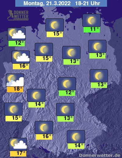 Heute Abend ist der Himmel überwiegend sternenklar. Am Rhein und der Ems ziehen jedoch gebietsweise auch einige, regional auch dichte Wolken auf, es bleibt aber auch hier trocken. Die Höchstwerte liegen bei 11 Grad in Rostock und bis 18 Grad in Köln.