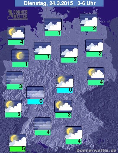 In der kommenden Nacht halten sich im Norden oft dichte Wolken, dabei bleibt es aber trocken. Sonst ist es zumeist aufgelockert, gebietsweise auch nur leicht bewölkt. Stellenweise bildet sich Nebel oder Hochnebel, dazu bleibt es trocken. Die Temperatur sinkt auf 5 Grad im Breisgau und bis 0 Grad am Rothaargebirge.