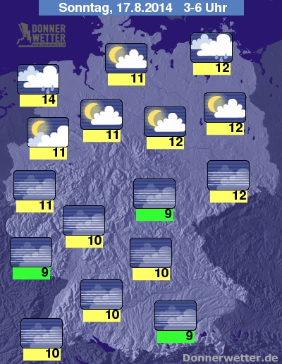 In der Nacht ist es vor allem in der Südhälfte verbreitet klar, stellenweise bildet sich Nebel. Im Seeumfeld können dichte Wolken zeitweise Regen bringen, sonst bleibt es bei aufgelockerter Bewölkung weitgehend trocken. Die Temperatur sinkt auf 14 Grad am Dollart und etwa 9 Grad am Saar-Nahe-Bergland.