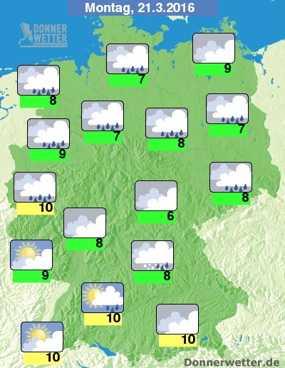 Am Montag ist es im Süden noch meist heiter oder wechselnd bewölkt und zum größten Teil auch trocken. Besonders über der Nordhälfte bleibt der Himmel aber bedeckt und es fällt zeitweise Regen oder Sprühregen. In den übrigen Landesteilen ist es meist stark bewölkt, jedoch zumeist auch trocken. Die Temperatur steigt auf 7 Grad in der Norddeutschen Tiefebene und bis zu 11 Grad im Breisgau.