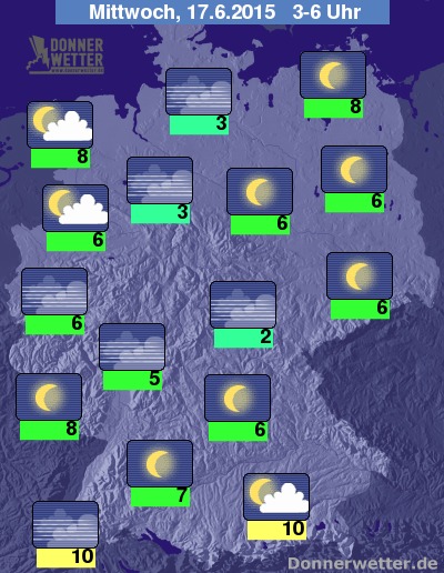 In der Nacht zum Mittwoch ist es verbreitet sternenklar oder nur leicht bewölkt, am Alpenrand halten sich auch teils dichtere Wolken, hier sind ein paar Tropfen möglich, sonst bleibt es trocken. Stellenweise bildet sich Nebel oder Dunst. Die Temperatur sinkt auf 10 Grad am Alpenrand und bis 2 Grad im Eichsfeld.