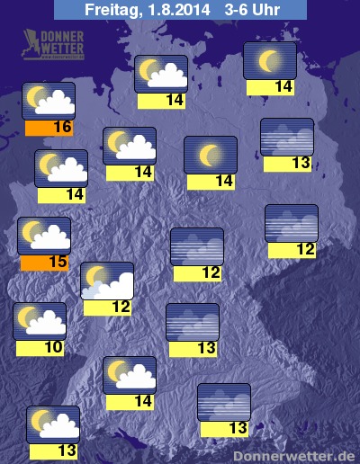 In der kommenden Nacht bleibt vor allem in der Osthälfte der Himmel verbreitet klar, lokal wird es hier neblig-trüb, weiter nach Westen ziehen häufig lockere Wolkenfelder durch. Es bleibt überall trocken. Die Temperatur sinkt auf 16 Grad an der nördlichen Ems und bis 10 Grad im Nordpfälzer Bergland.