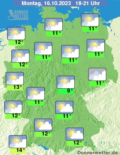 Heute Abend ist es über dem Norden teils stark, teils aufgelockert bewölkt. Im Süden ist es meist heiter bis sonnig und im übrigen Land teils locker, teils aufgelockert bewölkt. Es bleibt überall trocken bei Werten von 9 Grad in Jena und bis 14 Grad in Freiburg.