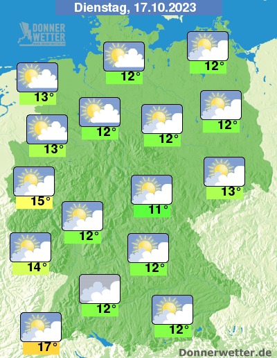 Am Dienstag ist es über dem Land verbreitet heiter oder sonnig, vor allem im Süden bleibt es aber auch gebietsweise trüb. Es bleibt überall trocken bei Werten von 11 Grad in Erfurt und bis 17 Grad in Freiburg.