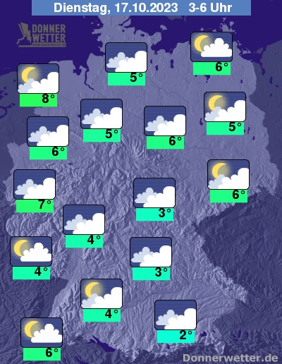 In der Nacht zum Dienstag ziehen oft dichte Wolken durch, gebietsweise lockert es aber auch auf, dazu bleibt es trocken. Die Temperatur sinkt auf 8 Grad in Wilhelmshaven und 2 Grad in Augsburg.
