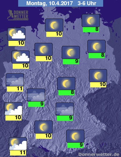 In der folgenden Nacht zeigt sich der Himmel zunächst bundesweit sternenklar. Im weiteren Nachtverlauf ziehen jedoch im Westen und Nordwesten mehr und mehr Wolken auf, dabei bleibt es aber noch zumeist trocken. Die Temperatur sinkt auf 11 Grad entlang des Rheins und bis 8 Grad an der Müritz.