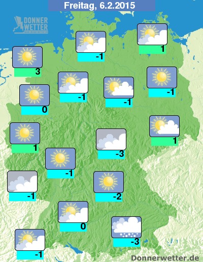Heute halten sich besonders an den Alpen, aber auch im Südwesten und in der Mitte von Deutschland oft noch dichte Wolken, die aber nur hin und wieder für leichten Schneefall sorgen können. Ansonsten ist es bereits am Vormittag überwiegend heiter oder aufgelockert bewölkt, oft auch schon sonnig und zudem trocken. Am Nachmittag scheint, mit Ausnahme des bayerischen Alpenrands verbreitet die Sonne und es ziehen meist nur lockere Wolkenfelder durch. Gebietsweise können sich jedoch auch dichtere Wolken halten. Dabei bleibt es trocken. Die Temperaturen bleiben überwiegend im frostigen Bereich und liegen zwischen -3 Grad in München und 1 Grad in Köln, an der See werden auch 3 Grad erreicht.