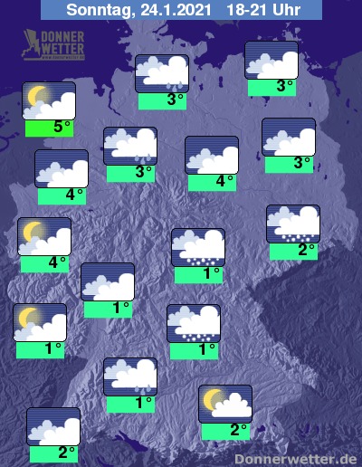 Heute Abend lockert die Bewölkung im Süden und Westen vielerorts auf, dazu fällt hier auch nur noch selten etwas Regen oder Schnee. Sonst bleibt es bei dichten Wolken und von Thüringen bis Sachsen fällt gebietsweise Schnee. In Niedersachsen fällt meist Schneeregen oder Regen. Die Temperatur liegt bei 1 Grad an der Schwäbsichen Alb und bis 5 Grad an der Nordsee.