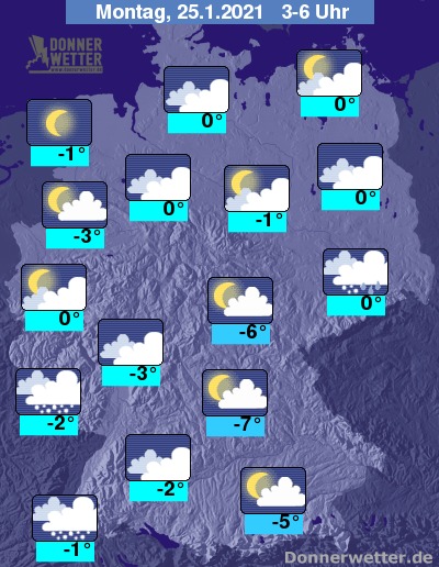 Am Montag zeigt sich das Wetter im Westen oft heiter bis sonnig und trocken, im übrigen Land halten sich hingegen dichte Wolken, dabei fällt gebietsweise Schnee, zum Teil auch Schneeregen. Die Temperatur steigt auf 0 Grad im Saargau und bis 4 Grad an der Nordsee.
