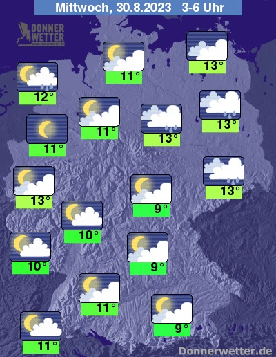 In der Nacht zum Mittwoch fällt im Osten aus dichten Wolken noch zeitweise Regen, der erst gegen Morgen abklingt bzw. nach Polen hin abzieht. Im übrigen Land ist es teils leicht bis aufgelockert, teilweise aber auch stark bewölkt, jedoch weitgehend trocken. Die Temperatur sinkt auf 13 Grad in Berlin und 9 Grad in München.